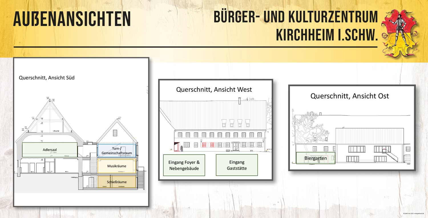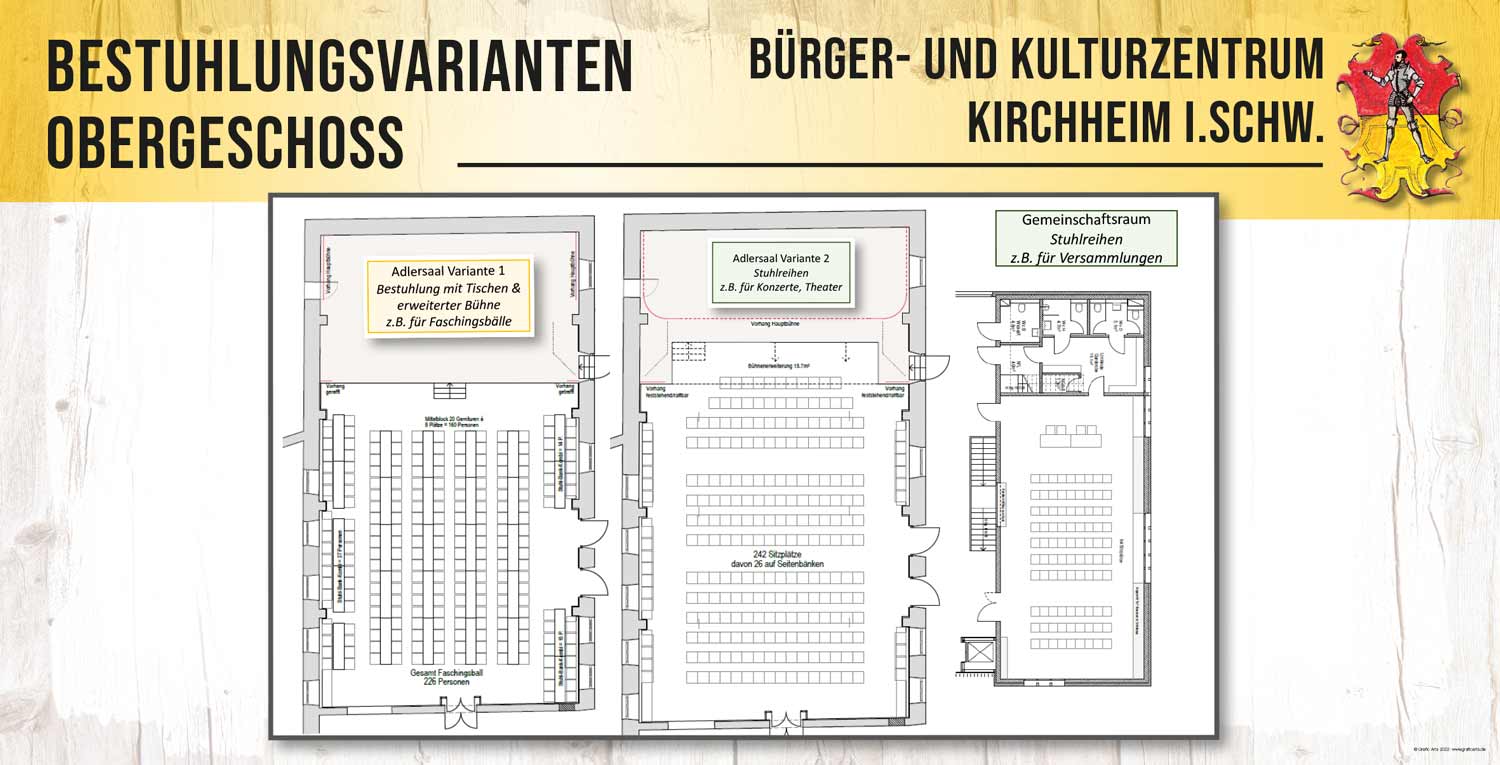 Zentrales Element wird auch zukünftig der 198 m2 große Adlersaal im OG mit seiner zusätzlichen Bühnenfläche von 67 m2 sein. Mit seinen 250 Plätzen bietet er Raum für unterschiedlichste Veranstaltungen.